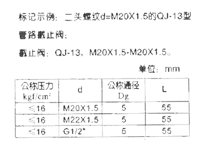 标记示例:二头螺纹d=M20*1.5的QJ-13型气动管路截止阀: